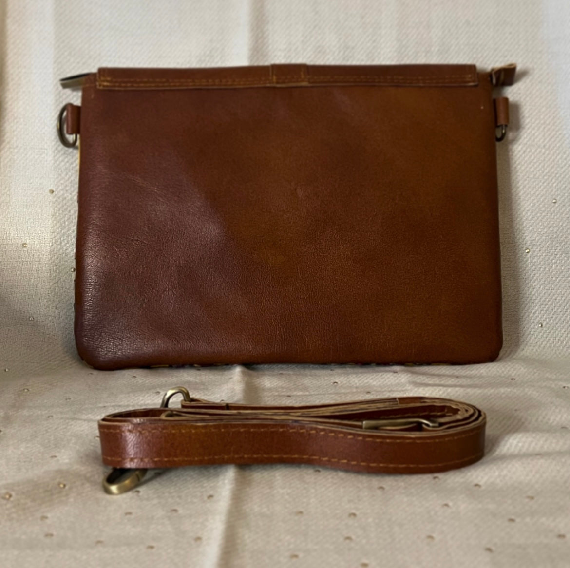- Materials: leather, wool, metal hardware